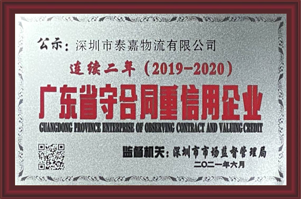 榮獲深圳市市場監督管理局,連續兩年(2019-2020年度),廣東省守合同重信用企業